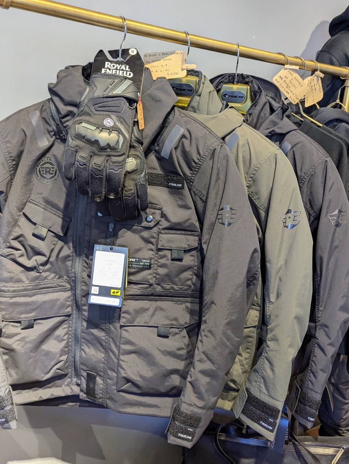東京セントラルではジャケット、グローブの各サイズ試着サンプルもご用意しています。