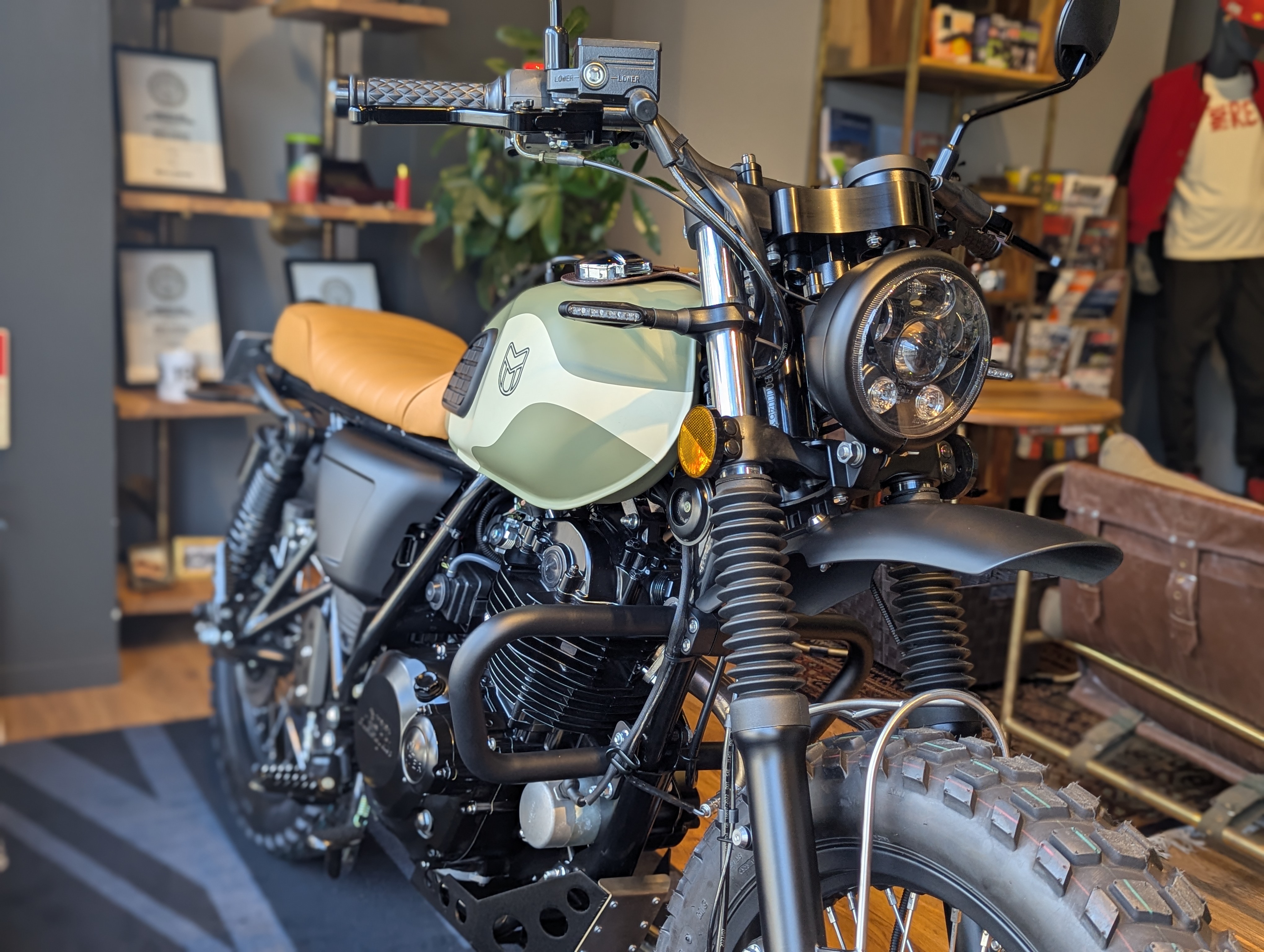 GT-SR 250cc Matt Black/Silverワイド ロードタイヤを装着し、その存在感を醸し出します。LEDヘッドライトやCNCパーツなどの近代的なパーツを使用し、モダンとクラシックが融合したスペシャリティな一台。【排気量】249cc(0.249L)【トランスミッション】5速リターン式【最大出力】13 kW (17.2 hp)【最大トルク】18Nm【シート高】810mm【全長 x 全幅 x 全高】2060mm × 760mm × 1150mm【車両重量】130kg【フューエルタンク】14L【エンジン】4-ストローク シングルシリンダー【燃料供給方式】フューエルインジェクション【規格】ユーロ5【タイヤ・ホイール(前後)】18インチ【ブレーキ】ABSブレーキシステム【エキゾースト】左出し